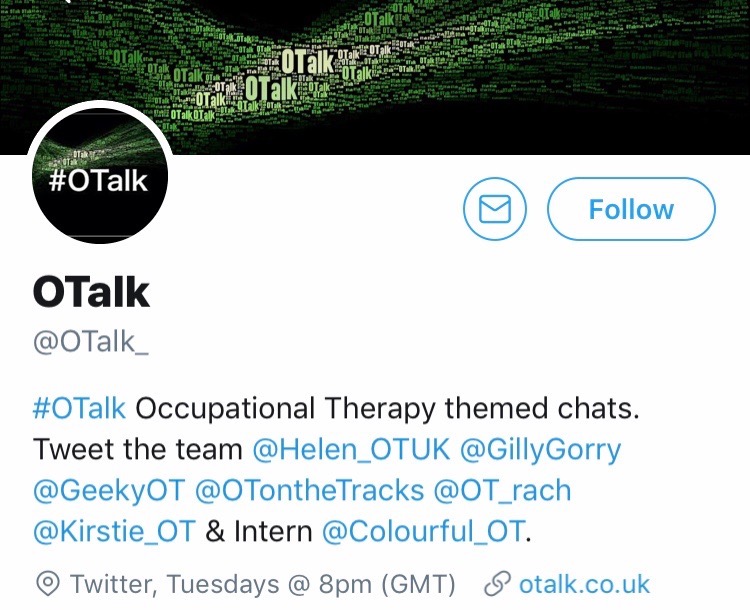 OTalk Twitter | Website Run by → Helen, Gilly, Clarissa, Kelly M, Rachel Booth, Kirstie, Carolina Cordero OTalk runs occupational therapy themed chats, every Tuesday at 8pm GMT. If you can’t catch them while it runs, don’t worry – there’s a full transcript of what goes down weekly. Past topics have included safeguarding issues and age appropriate occupations.