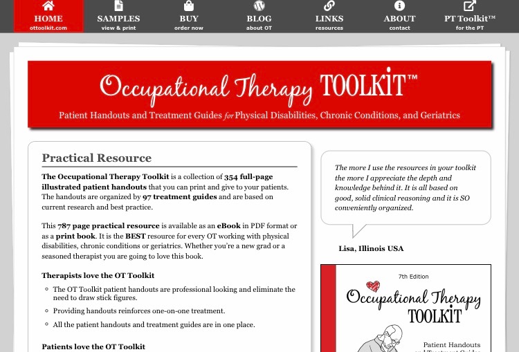 Cheryl Hall OT LinkedIn | Instagram | Pinterest | Website Cheryl Hall has created the Occupational Therapy Toolkit, a comprehensive collection of illustrated patient education handouts. The OT Toolkit is split into 97 treatment guides for geriatrics, physical disabilities, and chronic conditions.