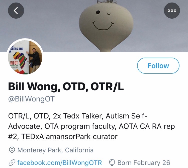 Bill Wong OTD, OTR/L Twitter | Facebook Bill Wong has spoken at AOTA, TEDx, and more. He has publicly shared about being autistic and learning to embrace himself. On Twitter, he educates others on occupational therapy for autism and keeps followers updated on where his next speaking gigs will be.